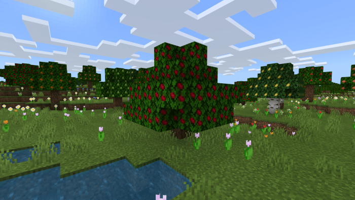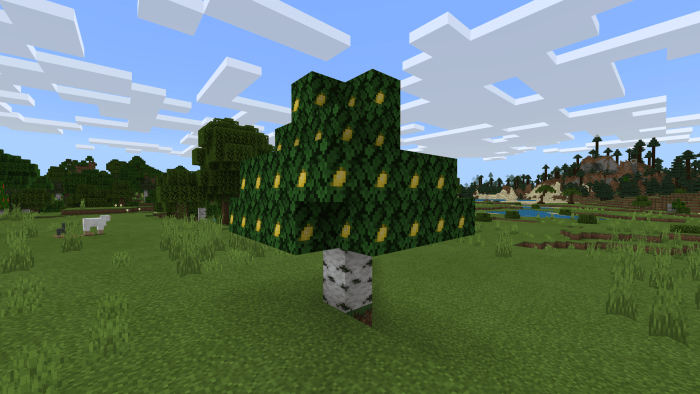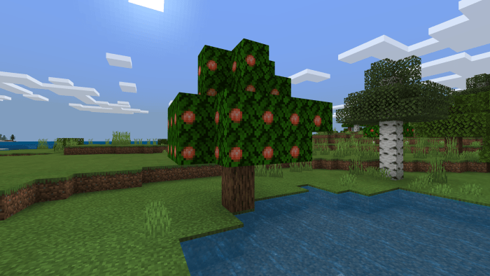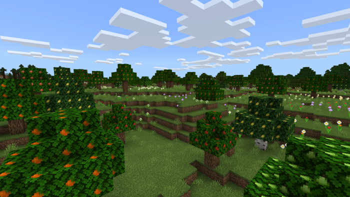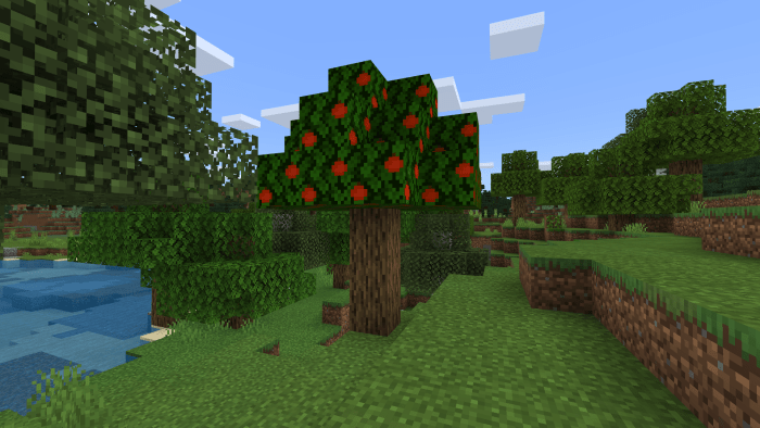 Apple, Orange, Pear, Peach, Lemon, Cherry, Banana Trees – These spawn in Forest, Plains, and especially in the new biome: Orchards.
