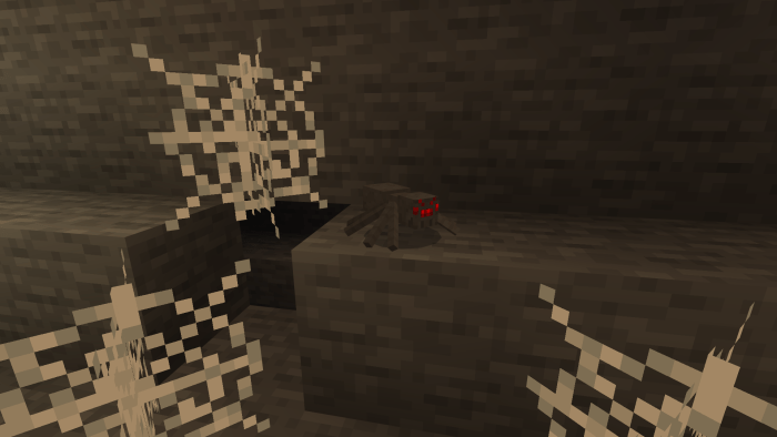 Queen Spider and Baby Spider – Spawns in the Spider Cave. The Queen is a miniboss with 550 health, and it shoots web projectiles that give slowness for 10 seconds, with a poison melee attack that poisons you for 5 seconds. The queen spider can spawn baby spiders. Killing the queen drops totem of undying and/or diamonds.