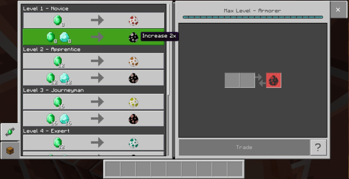 In survival the resize suits can be traded for with the villager armorer. At 2x decrease you can fit through one block holes, at 4x decrease you can fit through slabs, 16x fits between the end portal and a block, and at 128x you can fit in between a chest and a block.