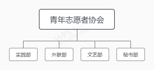 青年志愿者协会设立秘书部、外联部、文艺部、实践部四个部门。设会长一名,副会长两名共同管理各部门工作,各部门部长、副部长各一名负责管理所负责部门的工作,以及志愿者若干名开展志愿服务工作。