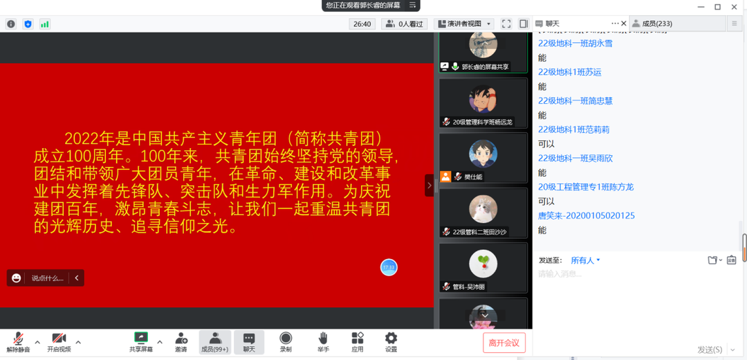 团课伊始,郭长睿以共青团团歌《光荣啊,中国共青团》开题为同学们讲述了一百年来共青团的光荣历程、具体讲解了共青团的发展历史。从1919年5月4日的“赵家楼”事件开始,点燃了共青团的星星之火,历经百年已成燎原之势席卷整个中华大地。100年来,共青团牢记初心、坚守使命,始终坚持党的领导,团结和带领广大团员青年,在革命、建设和改革事业中发挥着先锋队、突击队和生力军作用。