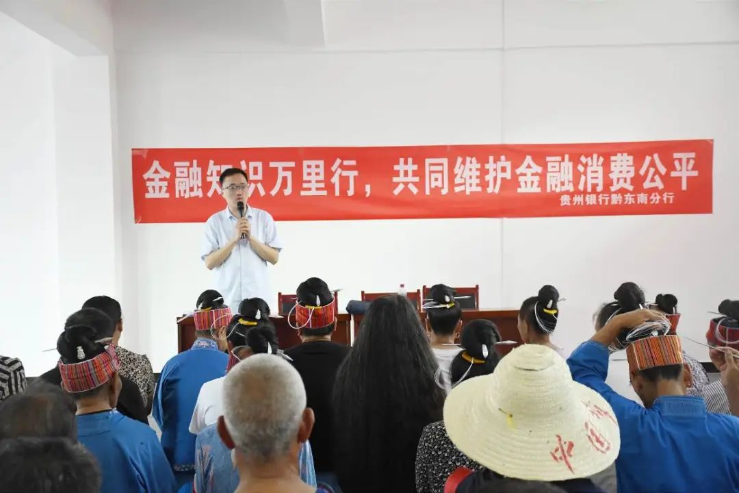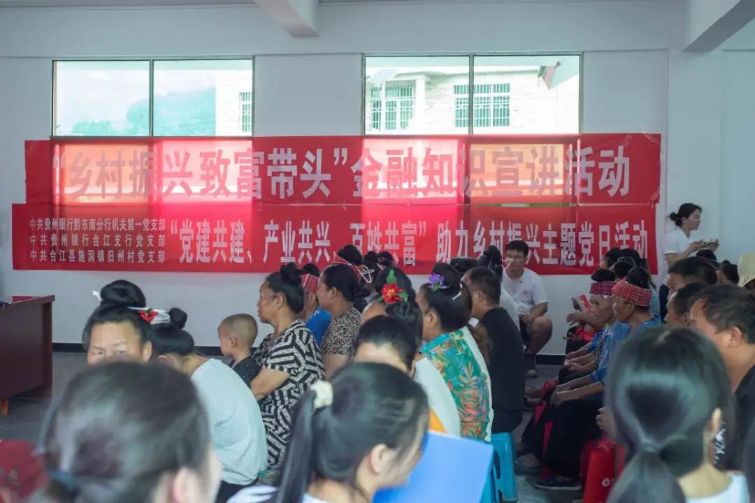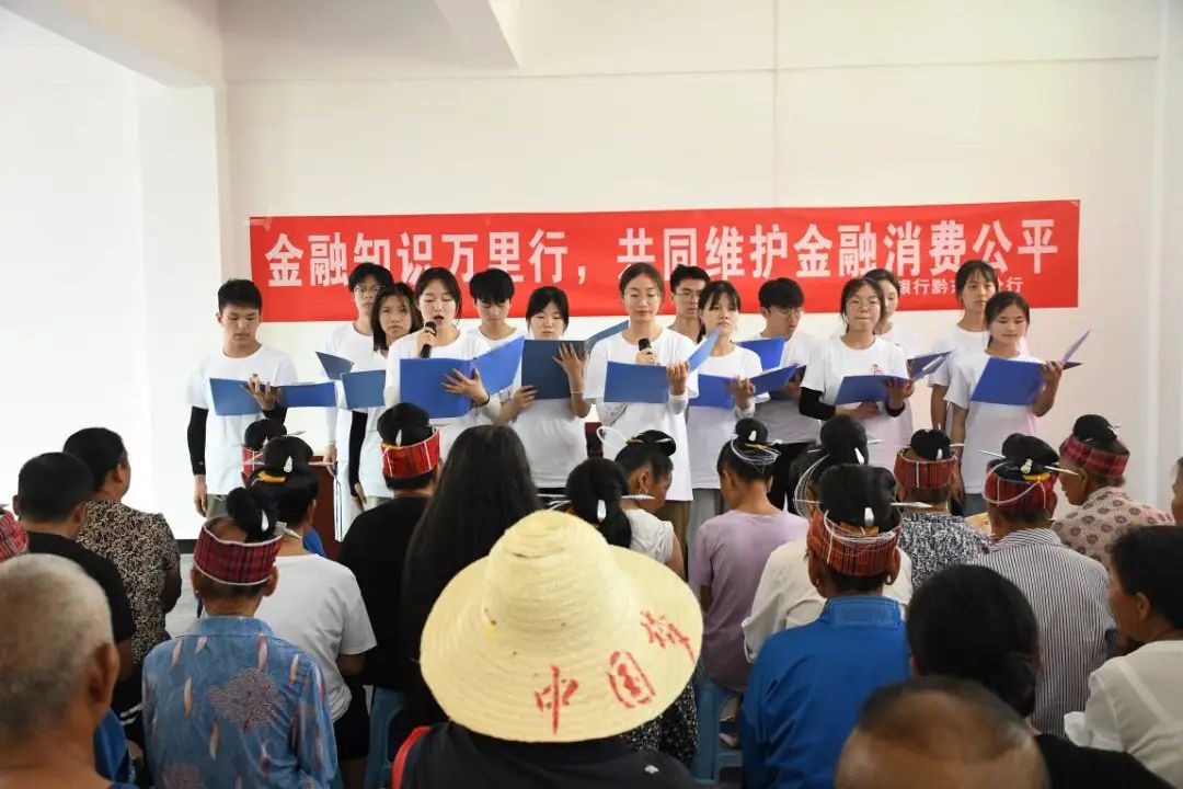 活动前,贵州银行总行个人业务部金融知识宣讲师、团委副书记康睿、贵州银行黔东南分行团委书记龙安波、贵州银行黔东南分行团委宣传委员石莉、贵州银行黔东南分行个人业务部消保经理黄林凤贵州银行台江支行个人客户经理邰圆红向村民发放金融知识手册,由公司暑期“三下乡”“星火乡筑”实践团为当地村民带来朗诵节目——《仰望党旗》,紧接着贵州银行台江支行工作人员向村民们讲解有关货币、投资、保险和金融机构等基本概念,同时普及了存贷款、银行卡安全知识以及如何进行低风险理财等知识,为村民们答疑解惑,帮助村民们提高金融风险防范意识。除此之外,成员们还宣传了电话诈骗、冒充亲友要求转账、非法集资诈骗等多种常见的诈骗方式,向村民们耐心讲解识别金融诈骗、保护个人信息的重要性。最后,实践团队员向村民们分发肥皂、牙刷等小礼品,现场宣传气氛热烈,村民积极参与其中。