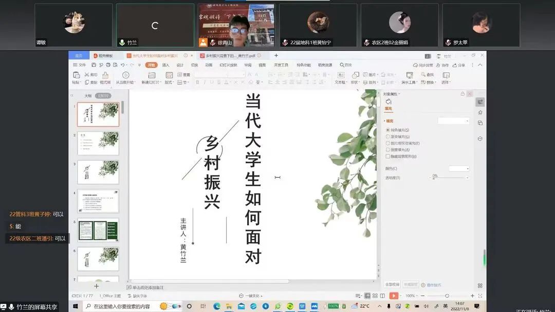 活动伊始,黄竹兰通过讲解乡村振兴的意义与目的引入主题,结合《中共中央、国务院关于做好2022年全面推进乡村振兴重点工作的意见》告诉同学们“保障国家粮食安全”“不发生返贫”是做好“三农”工作要牢牢守住的两条底线,并且阐述“守住两条底线”在乡村振兴中的重要性。活动中,黄竹兰强调,作为新时代中国青年,我们必须结合自己专业,从“产业振兴、人才振兴、文化振兴、生态振兴、组织振兴”等五个方面着手,进行项目调查和研究,从而带动乡村振兴。同时,黄竹兰通过视频、文字和图片,展示分享自己负责的“葡萄十里——品牌塑造赋能生态乡村”的项目,讲述助力“黔货出山”的经历,对互联网+的乡村振兴案例、美丽乡村与民宿案例等进行深入剖析,让同学们对如何助力乡村振兴有了更进一步的了解与认识。