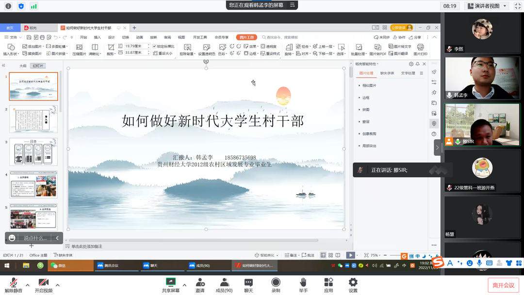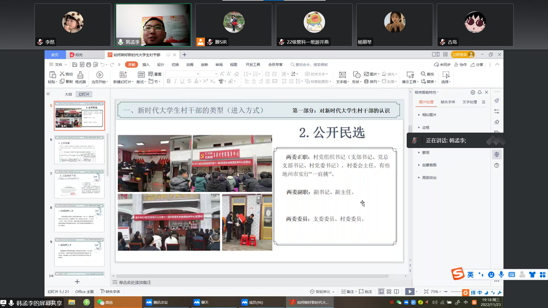 为使广大青年员工深入了解基层工作,同时结合自身专业知识,积极投身贵州乡村建设,服务群众、服务基层、服务农业农村经济发展。11月23日,伟德国际bevictor以线上腾讯会议的形式开展“如何做好新时代老员工村干部”讲座活动。本次活动特邀公司2012级员工、遵义市汇川区芝麻镇高原村党总支部书记、村委会主任韩孟李作为主讲嘉宾,全院一百余名同学参加。此次活动由公司农村发展系主任滕明雨老师主持。